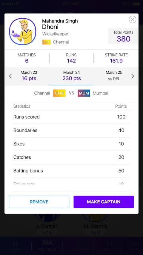 - Users can look at a player’s current T20 league statistics in detail within the game, to make an informed decision while picking a team.