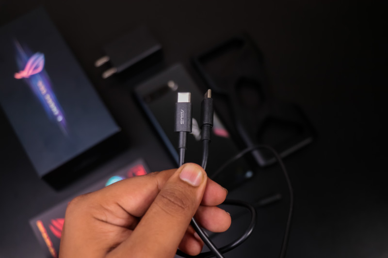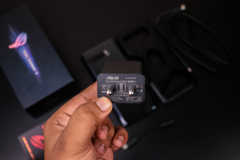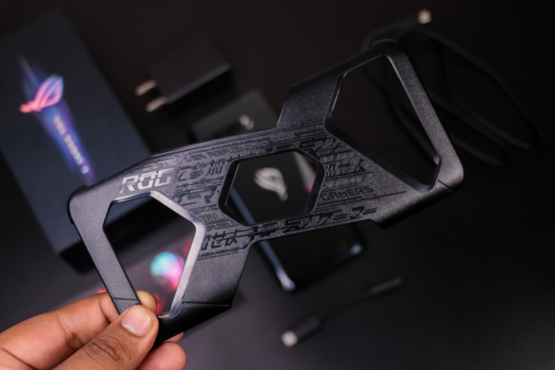On the left, it sports a Dual USB Type-C port in the middle which is covered with a removable part of rubber alongside a SIM Tray. This port provides optimal positioning in landscape mode while gaming. However, this port is made for the Aeroactive 3 cooling fan accessory. This Aeroactive 3 fan boosts in cooling the device while you gaming in a performance mode which is known as ‘X-mode’. Asus is also selling a plethora of accessories for this device as they did it for ROG Phone 2. Some of the accessories are a Dock station for using it with TVs, a dock station to use your device with a monitor, mouse, and keyboard, and a gamepad that will turn your device into a handheld gaming console like Nintendo Switch. We didn’t get the shot to test them out thoroughly but we’ve tried these accessories on ROG Phone 2 and they were quite responsive and adds a bonus to your gaming experience.