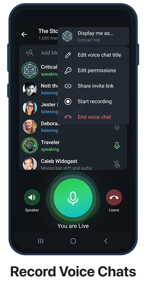 Admins of channels and public groups can now host voice chats for millions of live listeners. To start a Voice Chat, they would need to open the profile of any group or channel where they are an admin, they can tap on ⋮ or ⋯ and select Start Voice Chat. - Record Voice Chats-