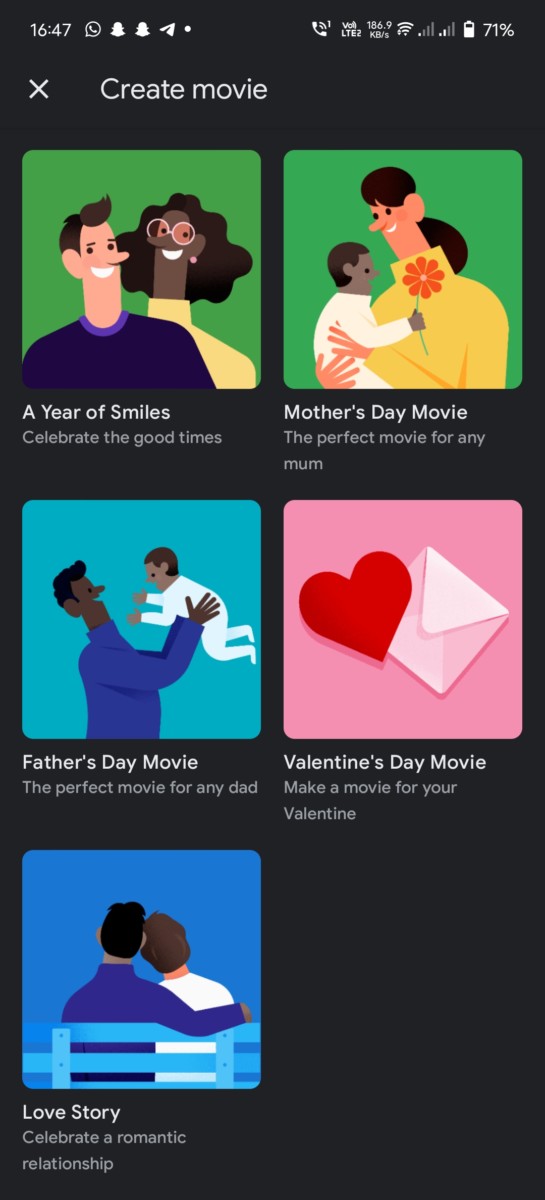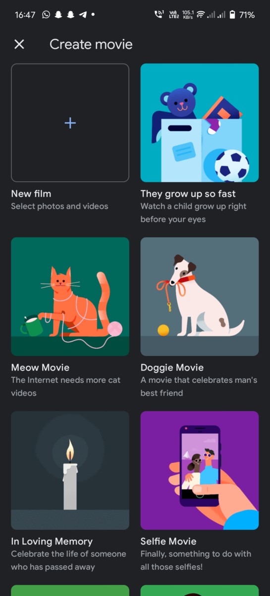 - There are templates like Meow Movie, Doggie Movie, and selfie movie and many more.