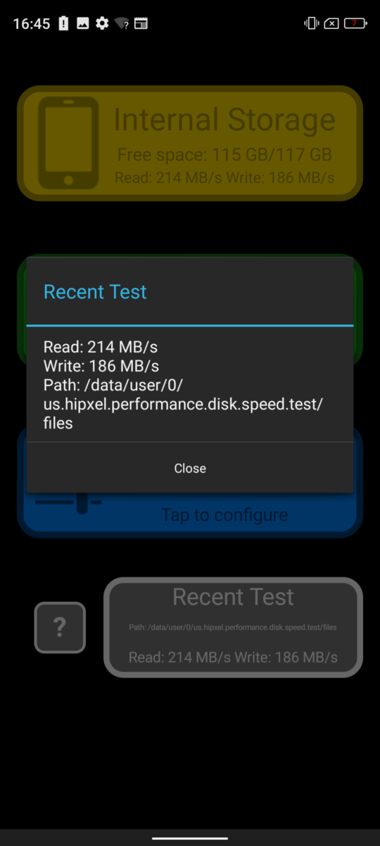 The display panel holds a resolution of up to 2400 x 1080 pixels with a punch-hole selfie cutout on the top. The viewing angles are good under direct sunlight and colours look suitably punchy. The default tuning tunes vivid colours which aren’t accurate but can be tuned under settings with three tuning modes:- Standard, Vivid, Cool Color and else you can customise the display to your taste. Black levels aren’t quite good in the dark mode, it ends up looking grey which doesn’t interrupt the experience. It has the support for Widevine L1 Certification which is an addition to your binge-watching experience in HD. In the Disk speed test, it delivered a read speed up to 214MB/s and a Write speed up to 186MB/s.