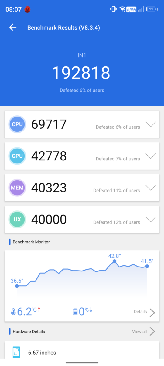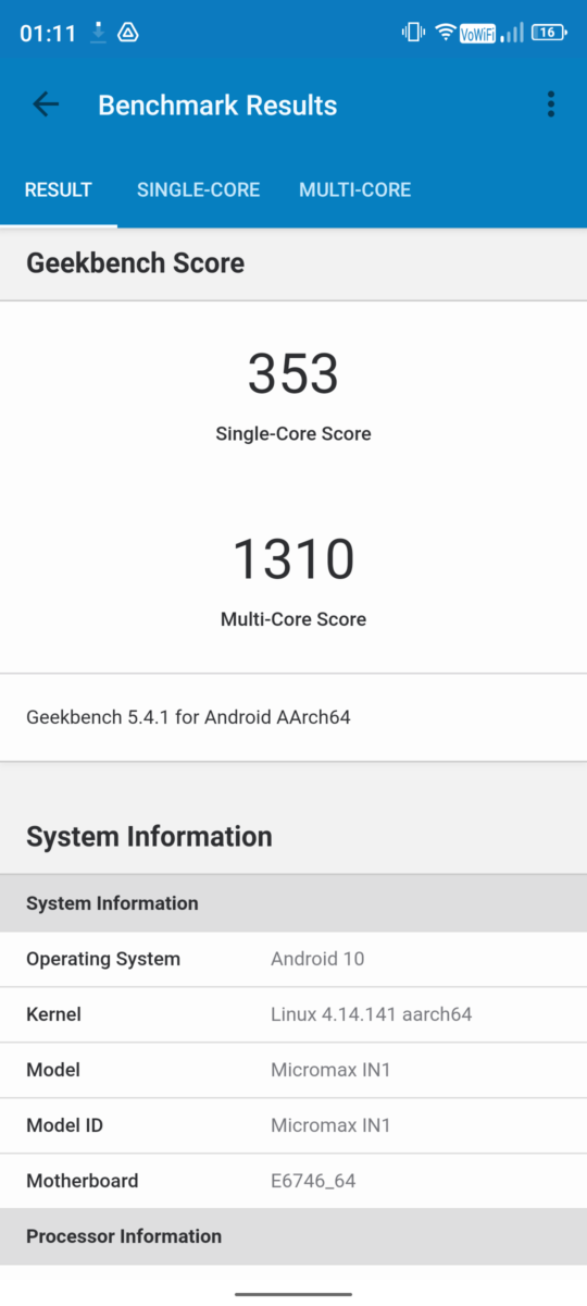 The Micromax In 1 retains the MediaTek Helio G80 SoC and Mali-G52 graphics under the hood which is quite similar to the Qualcomm Snapdragon 662 which lies under its competitors. Even this chipset is capable enough to handle the tasks for day-to-day use with moderate frame drops. It is coupled with 6GB RAM and up to 128GB ROM. However, Realme Narzo 30A is slightly cheaper than the Micromax In 1; powered by MediaTek Helio G85 is a powerful SOC when compared with MediaTek Helio G80. In CPU Throttling Test, The CPU throttled to 90% to its max performance.
