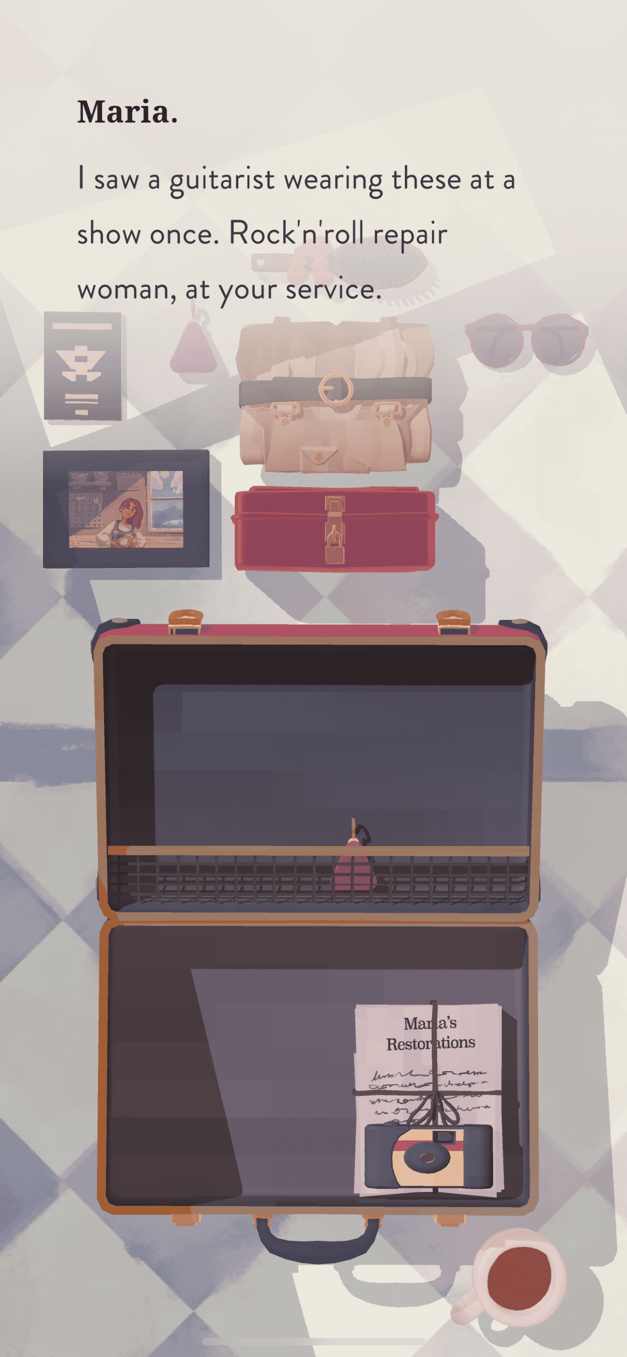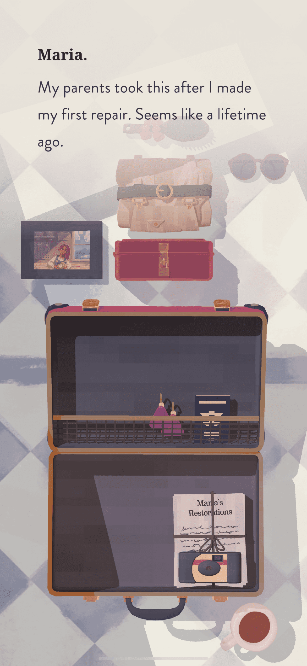 The game is divided into chapters, 14 of them as of now. Each chapter has a new object for you to fix, and a new place you get to visit. In chapter 1 – Arrival, you (Maria) reaches a place called Bellariva and unpacks her suitcase.