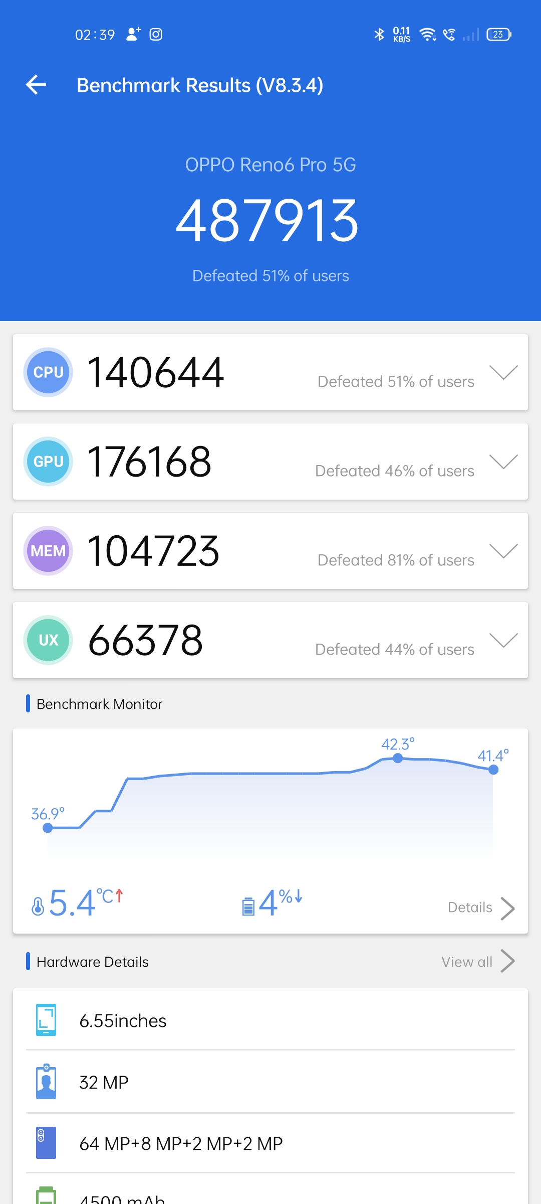 It comes with Widevine L1 Certification which let you stream high definition content on other OTT platforms. In the CPU throttling test, the CPU throttled to 78% to its max performance. As far as benchmarks results are concerned, Oppo Reno 6 Pro scored 487913 in the Antutu Benchmark and In Geekbench, it scored 820 in Single-Core score and 2760 in Multi-Core score. With UFS 3.1 storage, the read speed is 1.1GB/s and the write speed is 845MB/s.