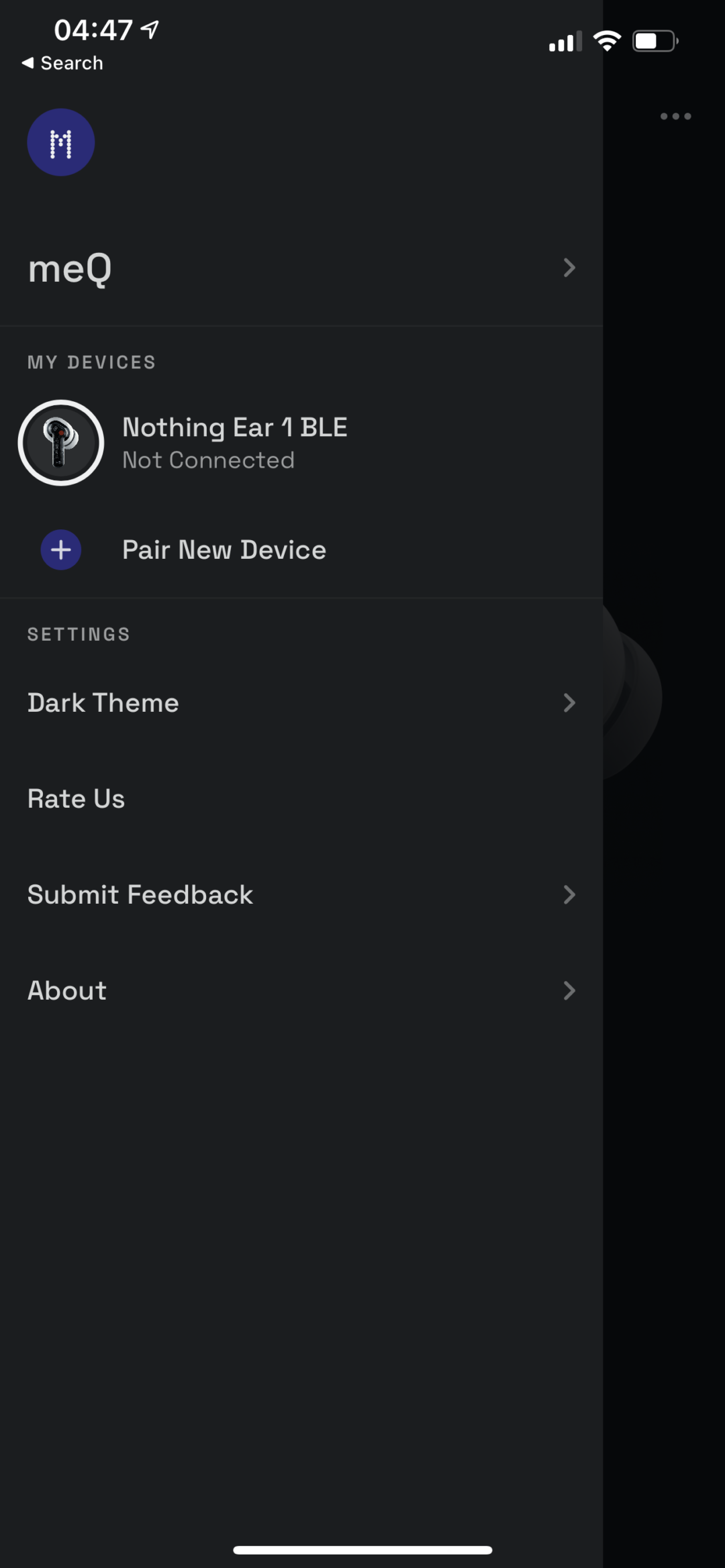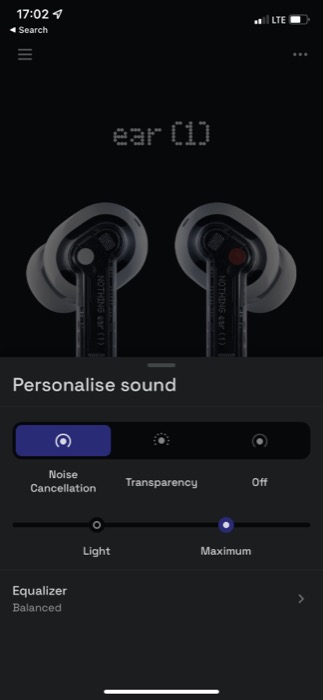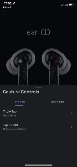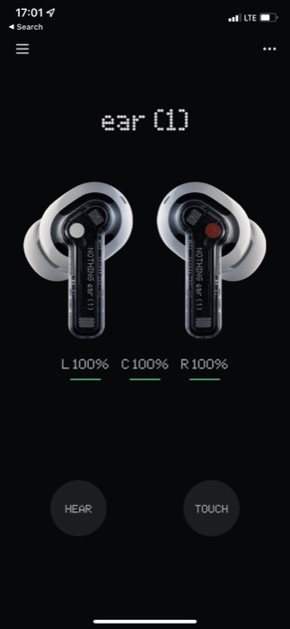 First time pairing is seamless, keep the only button on the case pressed and open the app. As soon as they are paired you see the page that says ‘MEET EAR (1)’ and shows all the default controls –
