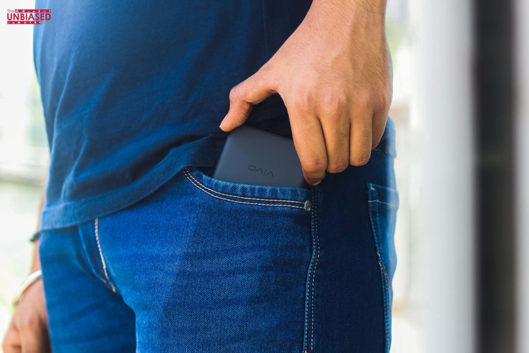 With the likes of Samsung, OnePlus, and Xiaomi, this smartphone looks more elegant and luxurious to hold. This mammoth two-step camera module also drives weight along with being the most noticeable trace on it. The device wobbles a lot if you touch the left side of the display when it’s kept on a flat surface like a table. Along with to its right, it houses a reflective glass with ‘PRO+’ written in a rectangular box and ‘ Vivo | ZEISS Co-engineered’ next below to it. This reflective area can be useful to click selfies from the rear camera but it becomes unpleasant while clicking mirror selfies and tends to catch smudges and fingerprint traces easily.