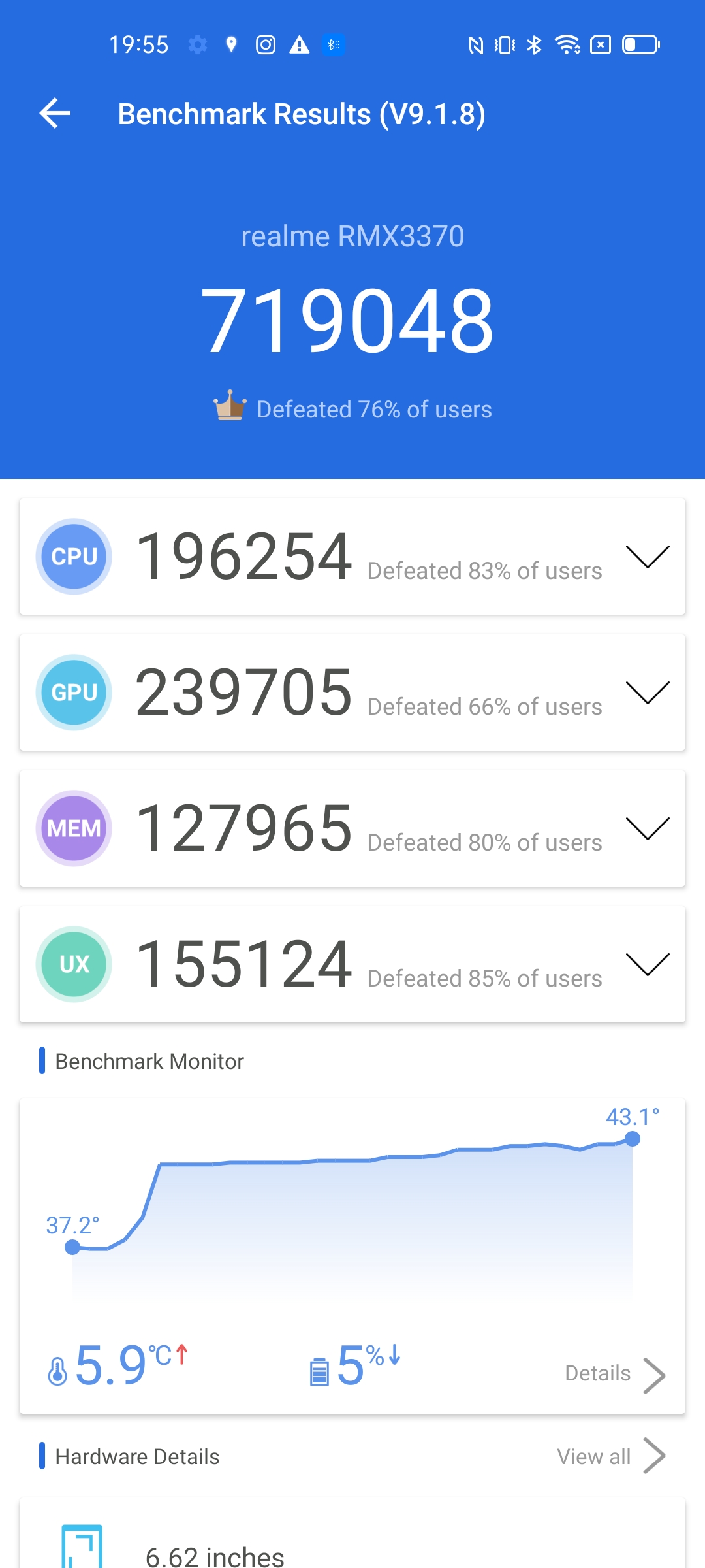 Realme made a nice decision to onboard the Qualcomm Snapdragon 870 in Realme GT Neo 2 which makes it sit between the Realme GT Master Edition’s 778G and Realme GT’s 888 Processor. This chipset is based on 7nm architecture which delivers a clock speed of up to 3.2Ghz. The X55 5G modem enables the support of 5G connectivity. It comes with UFS 3.1 storage with a reading speed of up to 1.3GB/s and a write speed of up to 694MB/s. As far as benchmark scores are concerned, it scores 719048 in Antutu Benchmark where the temperature rises from 37.2 degrees to 43.1 degrees with a drop of 5% in battery. In CPU throttling, the CPU throttled to 86% to its maximum performance within 15 minutes with no evidence of heating. In GeekBench 5, it scores 1010 in Single-Core and 2970 in Multi-Core.