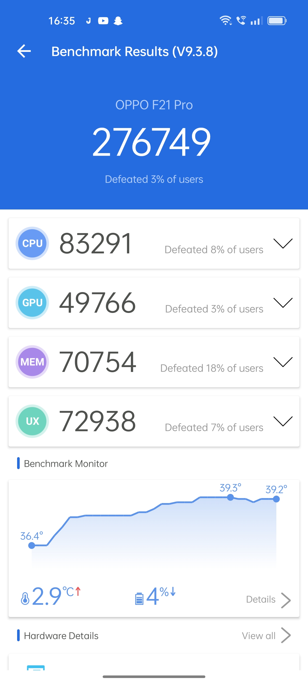 However, it is hard to ignore the fact that you can fetch far better devices than this at this price tier which includes processors like the Qualcomm Snapdragon 695, Mediatek Dimensity 900 and 920 chipset. As far as everyday performance goes, Oppo F21 Pro absolutely sails swiftly when it comes to multitasking, launching apps or using its camera for capturing moments. With the famous game titles such as BGMI, we were able to play it at Smooth Graphics at High frame rates which is not the best experience in this segment. The iQoo Z6 Pro which comes at the same price tier were able to max out BGMI at HDR graphics on Ultra frame rates and COD at Very High graphics on Max frame rates without any stutters in the gameplay. As far as benchmark scores are concerned, it scores 2,76,749 on Antutu Benchmark, 383 in the Single-Core score and 1658 in the Multi-Core score on GeekBench 5. During our CPU Throttling Test, the CPU throttles to 70% to its max performance.